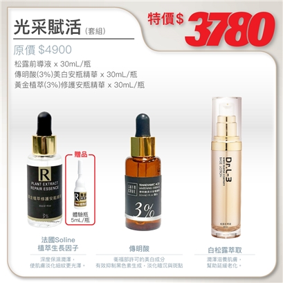 | 松露前導液30ml+傳明酸(3%)美白安瓶精華30ml+黃金植萃(3%)修護安瓶精華30ml(加贈5ml體驗品) |