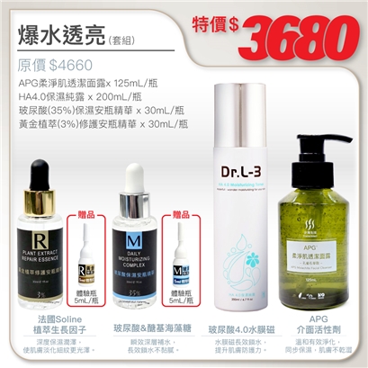 | APG柔淨肌透潔面露125ml+HA4.0保濕純露200ml+玻尿酸(35%)保濕安瓶精華30ml(加贈5ml體驗品)+黃金植萃(3%)修護安瓶精華30ml(加贈5ml體驗品) |