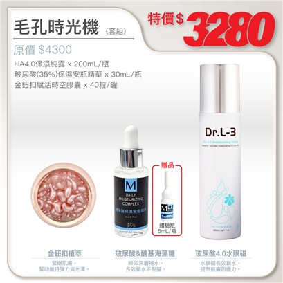 | HA4.0保濕純露200ml+玻尿酸(35%)保濕安瓶精華30ml(加贈5ml體驗品)+金鈕扣賦活時空膠囊40pcs(加贈2pcs體驗品) |