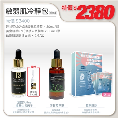 | 洋甘菊(20%)舒緩安瓶精華30ml+藍銅胜肽賦活面膜5PCS+黃金植萃(3%)修護安瓶精華30ml(加贈5ml體驗品) |