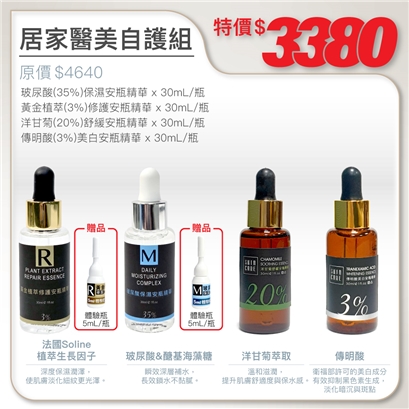 | 玻尿酸35%保濕精華30ml(贈5ml體驗品)+黃金植萃3%修護精華30ml(贈5ml體驗品)+洋甘菊20%舒緩精華30ml+傳明酸3%美白精華30ml |