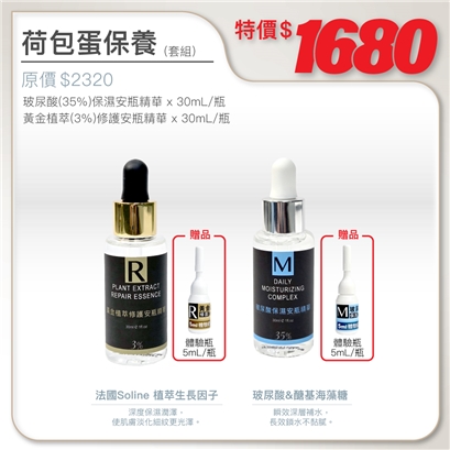 | 玻尿酸(35%)保濕安瓶精華30ml(加贈5ml體驗品)+黃金植萃(3%)修護安瓶精華30ml(加贈5ml體驗品) |