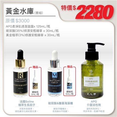 | APG柔淨肌透潔面露125ml+玻尿酸(35%)保濕安瓶精華30ml(加贈5ml體驗品)+黃金植萃(3%)修護安瓶精華30ml(加贈5ml體驗品) |