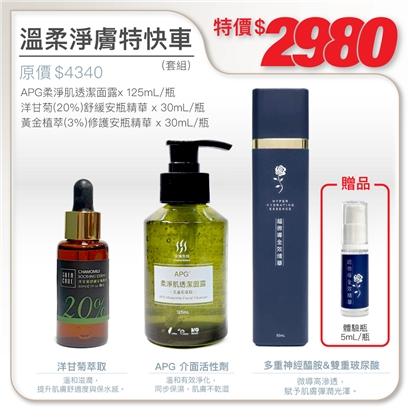 | APG柔淨肌透潔面露125ml+洋甘菊(20%)舒緩安瓶精華30ml+超微導全效精華50ml(加贈5ml體驗品) |