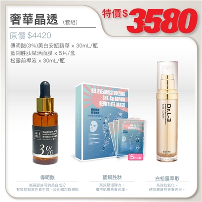 | 松露前導液30ml+傳明酸(3%)美白安瓶精華30ml+藍銅胜肽賦活面膜5PCS |