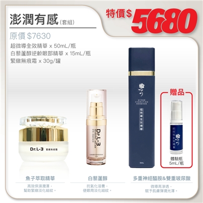 | 超微導全效精華50ml(加贈5ml體驗品)+白藜蘆醇逆齡眼部精華15ml+緊緻無痕霜30ml |