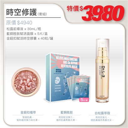 | 松露前導液30ml+藍銅胜肽賦活面膜5pcs+金鈕扣賦活時空膠囊40pcs(贈2PCS體驗品) |